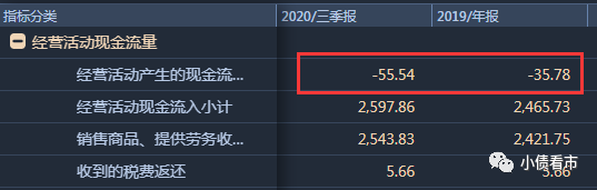 值得注意的是,在業績上升的同時,廈門國貿的經營獲現能力卻在持續惡化。2019年和2020年前三季度其經營性現金流凈額分別為-35.78億和-55.54億元。