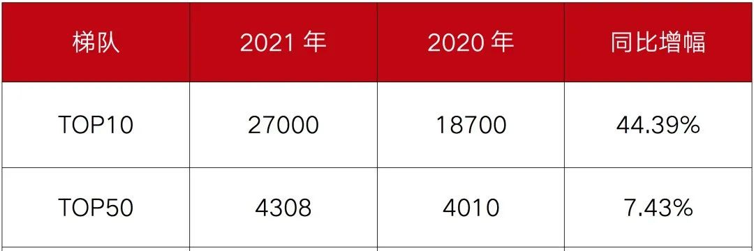 與2020年相比,TOP10門檻提升8300萬方,增幅為44.39%;TOP50門檻提升298萬方,增幅達7.43%。較2020年,TOP10的門檻增幅最大,頭部企業(yè)的提升度進一步加速。