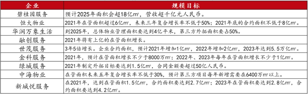 頭部企業(yè)更是定下高達數億的增長目標,恒大物業(yè)2021年在管面積將破6億㎡,合約面積不低于8億㎡;綠城服務合約面積將新增1.5億㎡,碧桂園服務則表示2025年規(guī)模超18億㎡,營收要超過千億元。世茂服務亦提出3年5倍計劃,2021年增加合約面積1億㎡,預計2023年合約面積達5.5億㎡。
