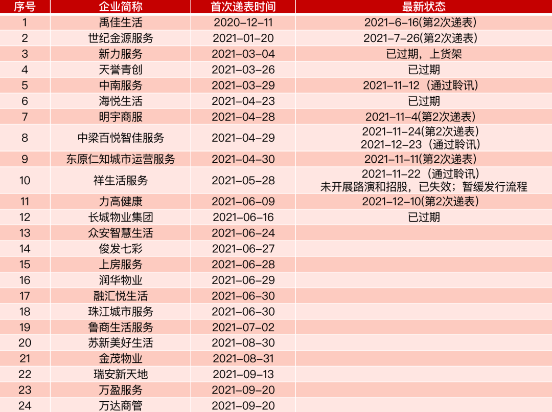 在市場的冰凍期,監(jiān)管層考慮、投資人離場心態(tài)、母公司急需資金紓困以及企業(yè)自身意愿的多重因素影響下,2021年下半年待上市物企被擺上貨架出售、推遲上市或者已經通過聆訊也暫停上市。