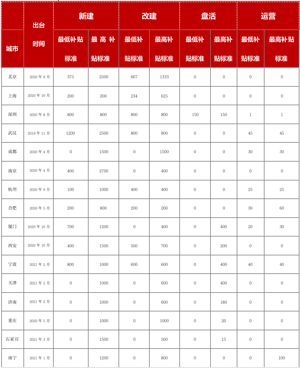 不同城市之間補貼標準差異較大,整體來說補貼發放還是以新建、改建類項目補貼為主,部分城市對盤活類、運營類項目有補貼。既所謂的大錢補供應,小錢補運營。