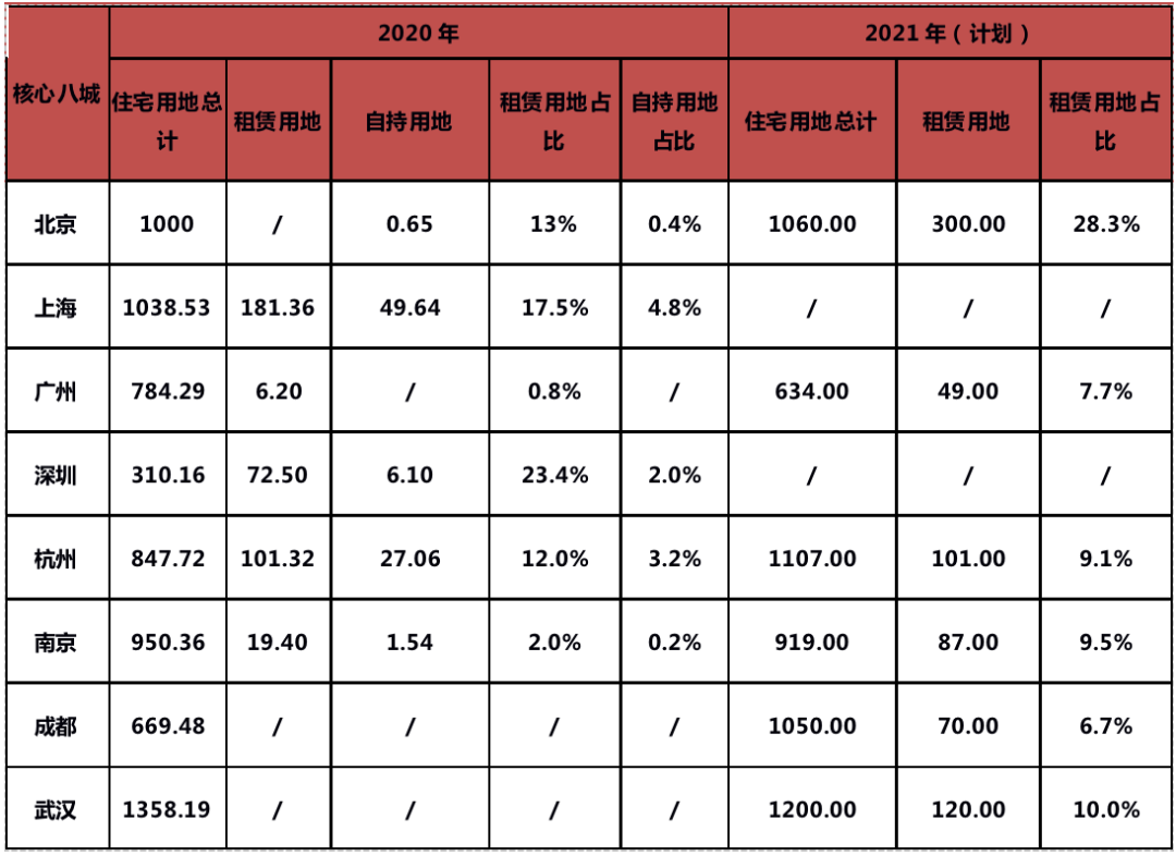由此看出國家已經從政策層面有效保障的租賃用地的供給,而目前已經正式公布2021年住宅用地供應計劃的核心六城也的確印證了這一點。
