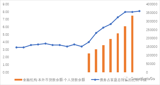 圖三:個人貸款余額及債務占家庭總財富的比例