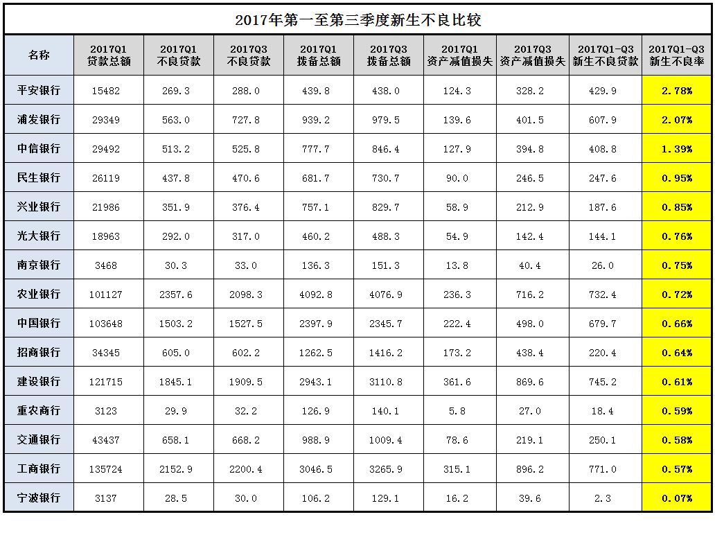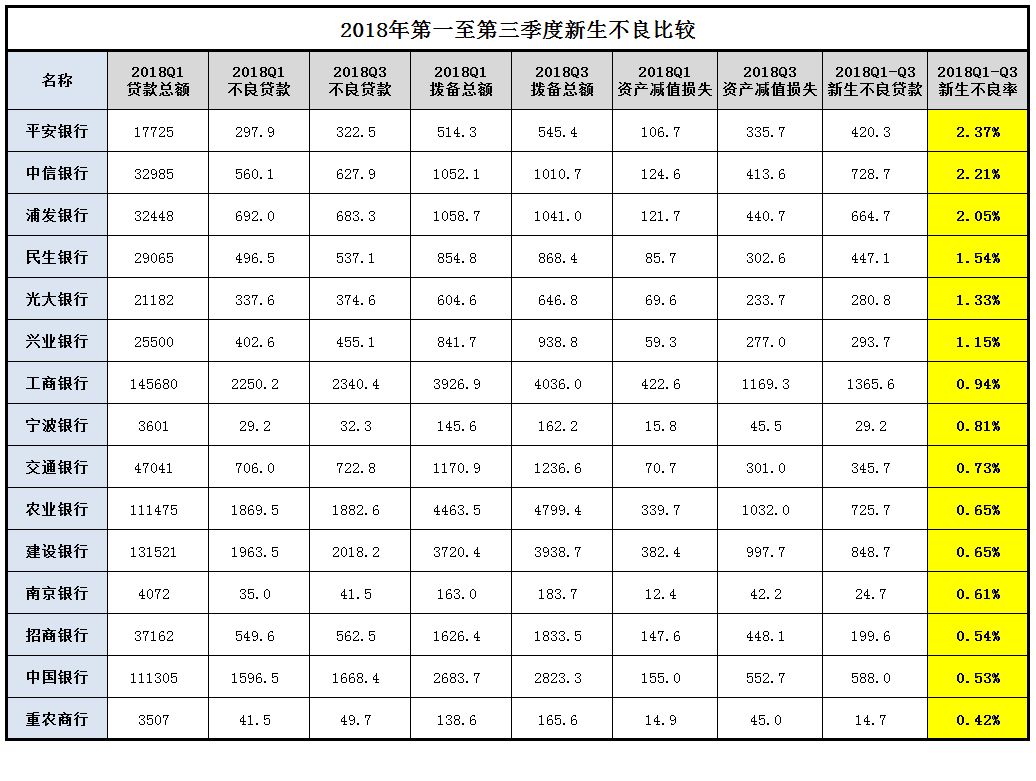 4、關(guān)于2018Q1至Q3新生不良率排名。這個排名才是最重要的,當(dāng)然也并不是說排名最高的就有問題,因為每家銀行的文化不一樣,有的激進一點,利率高不良也相對高一些,只要風(fēng)險和機遇能匹配就好,我們這個地方就沒有考慮這些,只是比較新生不良率的情況,也就是信用成本。一般情況下,銀行的損失的信用成本在2%左右就算及格,對應(yīng)到我們的新生不良率,一年下來控制在4%以內(nèi)就算及格,如果能在2%以內(nèi)就是資產(chǎn)質(zhì)量表現(xiàn)優(yōu)異。總體來看,2018年第二和第三季度行業(yè)的新生不良率并不算高,新生不良率最低的三家銀行是重慶農(nóng)村商業(yè)銀行,中國銀行和招商銀行,新生不良率最高的是平安銀行、中信銀行和浦發(fā)銀行。具體排序如下: