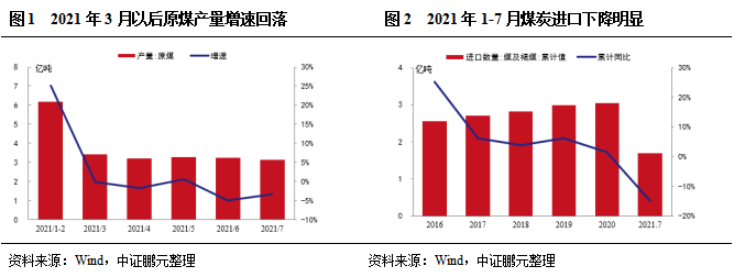 2021年1-7月原煤產(chǎn)量保持小幅增長(zhǎng),但產(chǎn)地供給持續(xù)受限。2021年1-7月,全國(guó)原煤產(chǎn)量22.6億噸,同比增長(zhǎng)4.9%,比2019年同期增長(zhǎng)4.8%。具體來(lái)看,2021年1-2月,全國(guó)原煤產(chǎn)量6.18億噸,同比增長(zhǎng)25%,主要系受冷冬及下游需求旺盛影響,產(chǎn)地煤礦開工率高,同時(shí)2020年年初受疫情影響原煤產(chǎn)量偏低。3月份以后,晉陜蒙主產(chǎn)地安全環(huán)保檢查頻繁,包括山西省開展持續(xù)到年底的煤礦安全大排查,陜西榆林煤礦超產(chǎn)檢查,山西晉北地區(qū)中央環(huán)保組督查等,此外內(nèi)蒙古反腐、煤管票持續(xù)。2021年3-7月,全國(guó)原煤產(chǎn)量同比增速分別為-0.2%、-1.8%、0.6%、-5%和-3.3%,煤炭實(shí)際供給持續(xù)受限。進(jìn)口方面,2021年1-7月煤炭進(jìn)口數(shù)量為1.7億噸,較去年同期下降15%,煤炭進(jìn)口整體收緊。