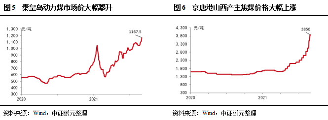 春節(jié)前供給偏緊張,同時(shí)寒冬采暖需求旺盛、焦鋼廠保持高開工率,動(dòng)力煤價(jià)格快速上漲,秦皇島動(dòng)力煤市場(chǎng)價(jià)(Q5500K,山西產(chǎn))一度超過(guò)1,000元/噸;春節(jié)期間,產(chǎn)地大部分煤礦由于保供任務(wù)正常生產(chǎn),同時(shí)下游工業(yè)企業(yè)放假,需求減弱,價(jià)格下降至2月末的567.5元/噸;3月份以后,下游企業(yè)復(fù)工復(fù)產(chǎn),需求快速恢復(fù),同時(shí)晉陜蒙主產(chǎn)地安全環(huán)保檢查頻繁,供給收緊,動(dòng)力煤價(jià)格開啟上漲。二季度后,安全事故頻發(fā)導(dǎo)致主產(chǎn)區(qū)安檢力度加大,動(dòng)力煤價(jià)格持續(xù)上漲,截至2021年9月初,秦皇島動(dòng)力煤市場(chǎng)價(jià)(Q5500K,山西產(chǎn))攀升至1,167.5元/噸,3月以來(lái)漲幅達(dá)到105.73%。煉焦煤方面,以京唐港山西產(chǎn)主焦煤為例,由于山西省全環(huán)保檢查頻繁,煉焦煤供給緊張,4月份以后下游鋼鐵需求走強(qiáng),價(jià)格持續(xù)上漲至9月初的3,850元/噸,2021年以來(lái)漲幅超過(guò)130%。