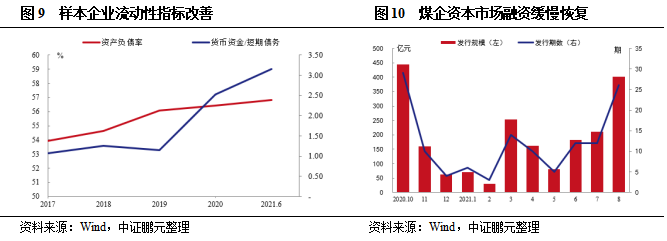 2021年6月末,樣本企業(yè)平均資產(chǎn)負(fù)債率為56.81%,明顯低于行業(yè)平均水平(66.14%),較2020年末變動(dòng)不大,樣本企業(yè)資本結(jié)構(gòu)仍未得到有效改善。2021年6月末,樣本企業(yè)貨幣資金/短期債務(wù)為3.15,較上年末水平上升0.62,樣本企業(yè)流動(dòng)性指標(biāo)繼續(xù)邊際改善。此外,2021年8月煤企債券市場(chǎng)共發(fā)行26期債券,融資規(guī)模超過(guò)400億元,已接近去年10月份的發(fā)行規(guī)模,行業(yè)融資逐漸回暖。預(yù)計(jì)隨著煤價(jià)繼續(xù)維持高位,樣本企業(yè)盈利將持續(xù)維持較高水平,經(jīng)營(yíng)活動(dòng)現(xiàn)金流持續(xù)凈流入,償債壓力邊際改善。