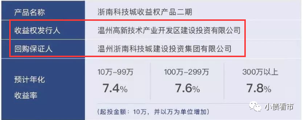 據(jù)悉,該收益權(quán)產(chǎn)品回購保證人為溫州浙南科技城建設(shè)投資集團有限公司(以下簡稱“浙南科技城建投集團”),產(chǎn)品期限為兩年,資金用途為浙南科技城八大重點項目建設(shè),認購起點金額為10萬元。