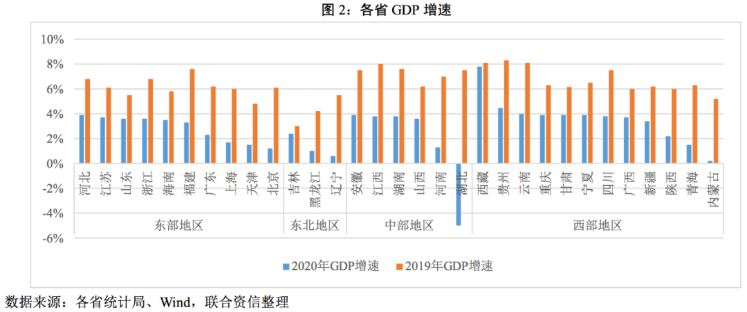 ?GDP總量在經(jīng)濟(jì)相對(duì)發(fā)達(dá)地區(qū)和欠發(fā)達(dá)地區(qū)的分化較為明顯,東部地區(qū)繼續(xù)維持領(lǐng)跑態(tài)勢(shì);2020年,除湖北以外,其余30個(gè)省份GDP增速全部轉(zhuǎn)正,中西部地區(qū)增速分化更為明顯,東北地區(qū)經(jīng)濟(jì)恢復(fù)相對(duì)較慢,東部地區(qū)則相對(duì)較為均衡。