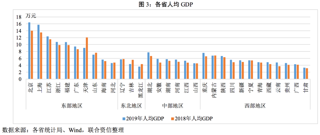 2020年各省份GDP規(guī)模變動(dòng)不大,且人口流動(dòng)短期內(nèi)并不會(huì)有趨勢(shì)性的變化,因此我們采用2019年的人均GDP進(jìn)行觀察。從2019年人均GDP規(guī)模看,東部地區(qū)領(lǐng)跑全國(guó),除了東部地區(qū)以外,其他地區(qū)沒有明顯分化。大部分省份人均GDP隨著經(jīng)濟(jì)規(guī)模的擴(kuò)大而進(jìn)一步提升,值得注意的是東三省以及天津、山東,2019年人均GDP較2018年反而下降,尤其是天津下降顯著,主要是因?yàn)樘旖蚣皷|三省的產(chǎn)業(yè)結(jié)構(gòu)均以石油化工、鋼鐵等傳統(tǒng)工業(yè)為主,而近些年隨著我國(guó)經(jīng)濟(jì)的轉(zhuǎn)型,傳統(tǒng)經(jīng)濟(jì)增長(zhǎng)動(dòng)力放緩,造成經(jīng)濟(jì)增長(zhǎng)放緩、人均GDP下降。