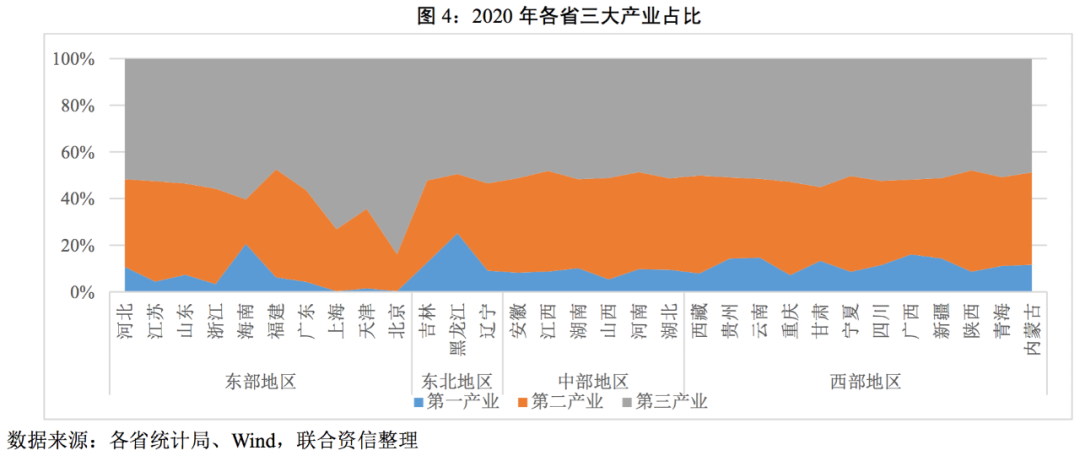 從三大產(chǎn)業(yè)規(guī)模占比看,第三產(chǎn)業(yè)是各省第一大產(chǎn)業(yè),與2019年相比幾乎沒有變化,與我國(guó)的經(jīng)濟(jì)產(chǎn)業(yè)構(gòu)成相一致。具體看,作為全國(guó)政治中心的北京以及內(nèi)陸金融中心的上海第三產(chǎn)業(yè)發(fā)展顯著優(yōu)于其他省份;海南和黑龍江的第一產(chǎn)業(yè)占比明顯高于全國(guó)其他地區(qū)。分區(qū)域看,東部地區(qū)和東北地區(qū)產(chǎn)業(yè)構(gòu)成差異更為明顯,而中部及西部地區(qū)產(chǎn)業(yè)構(gòu)成差異不大。