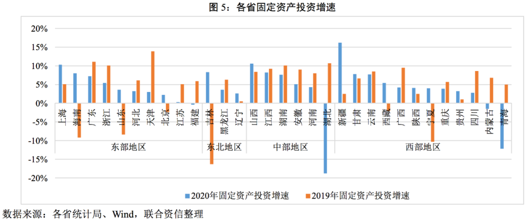 2020年各省份的固定投資增速較2019年有較大的變化,其中有13個(gè)省份固定資產(chǎn)投資增速超過2019年,18個(gè)省份不及2019年。除福建、內(nèi)蒙古、青海以及湖北以外,其余27個(gè)省份固定資產(chǎn)投資增速均實(shí)現(xiàn)正增長(zhǎng)。中部地區(qū)固定資產(chǎn)投資增速整體相對(duì)較高,除湖北以外均超過4%(全國(guó)固定資產(chǎn)投資增速為2.90%);西部地區(qū)分化較為明顯。