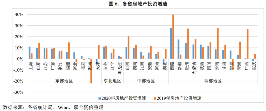 房地產(chǎn)投資方面,2020年31個(gè)省份中除重慶、天津以及湖北以外,其余28個(gè)省份房地產(chǎn)投資均為正增長(zhǎng);有15個(gè)省份房地產(chǎn)增速高于全國(guó)增速(7%),且有9個(gè)省份的增速已經(jīng)超過2019年同期水平。分區(qū)域看,西部地區(qū)房地產(chǎn)投資增速整體高于其他省份。進(jìn)一步比較固定資產(chǎn)投資增速與房地產(chǎn)投資增速發(fā)現(xiàn),僅江西、黑龍江、廣西、海南、重慶以及天津的固定投資增速大于房地產(chǎn)投資增速,大部分省份的固定投資增速依賴于房地產(chǎn)投資支撐,與全國(guó)投資結(jié)構(gòu)相同。