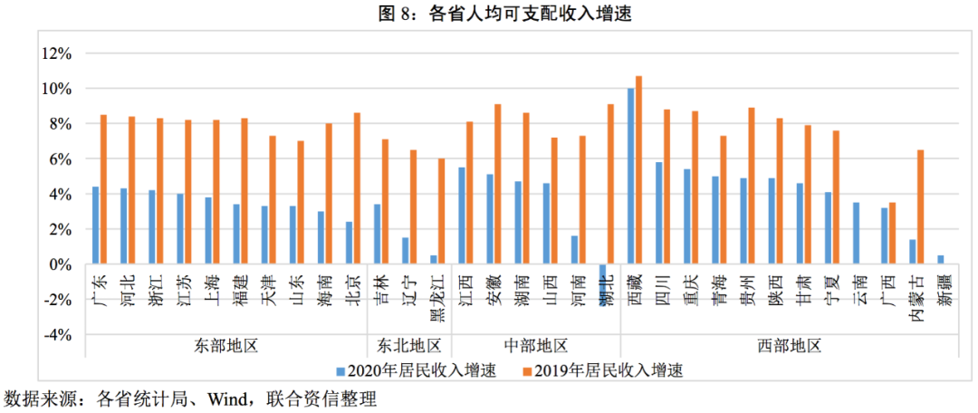 從GDP增速看,2020年除湖北以外,其余省份增速全部為正,其中西藏以7.80%的增速領(lǐng)跑全國(guó),主要是其受疫情沖擊較小;貴州以4.46%的增速連續(xù)第四年位列第二。整體看,有20個(gè)省份的GDP增速超過全國(guó)。分區(qū)域看,東部地區(qū)增速相對(duì)較為平穩(wěn),中部和西部地區(qū)GDP增速分化更為明顯,東北地區(qū)經(jīng)濟(jì)增速相對(duì)較低。
