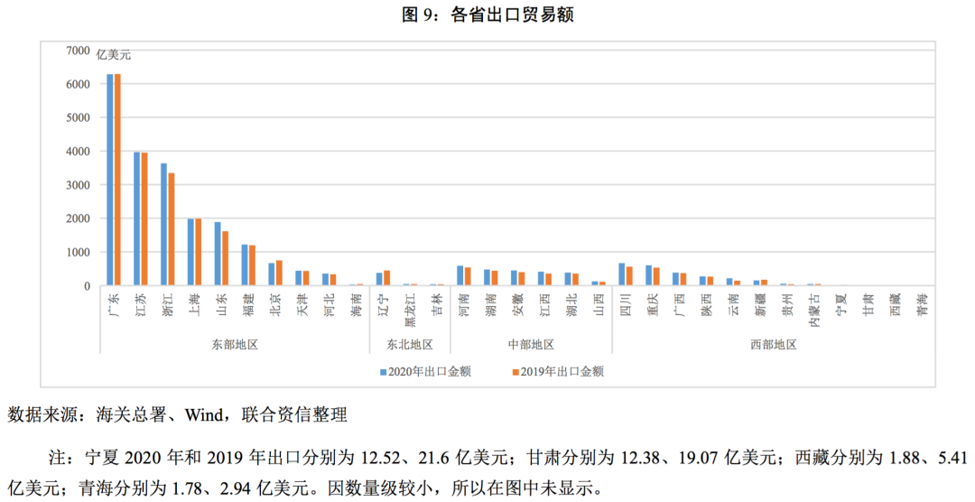 外貿(mào)方面,區(qū)域出口集中度較高。2020年,東部地區(qū)沿海城市廣東、江蘇、浙江、上海、山東以及福建出口貿(mào)易額(按美元計(jì)價(jià))占全部出口貿(mào)易額的73.24%,上述六省出口額較2019年增長(zhǎng)3.17%(全國(guó)增長(zhǎng)3.60%);而全年出口額不足百億的省份全部集中在西部和東北地區(qū)。與2019年相比,有12個(gè)省份出口金額出現(xiàn)下降,19個(gè)省份出口金額上升。分區(qū)域看,2020年東部、西部、中部以及東北地區(qū)出口占我國(guó)總出口比重分別為79.11%、9.53%、9.52%和1.84%,與2019年相比,中部、東部和東北地區(qū)出口比重均有下降,其中中部地區(qū)出口比重下降5.33個(gè)百分點(diǎn),下降較為明顯,西部地區(qū)出口比重略有上升。在我國(guó)的出口中,出口額較大的產(chǎn)品有機(jī)電設(shè)備、紡織品、家具玩具和車輛及零部件等,與上述東部沿海六省的產(chǎn)業(yè)結(jié)構(gòu)相對(duì)應(yīng),同時(shí)沿海的地理位置也為其出口提供了很大便利。