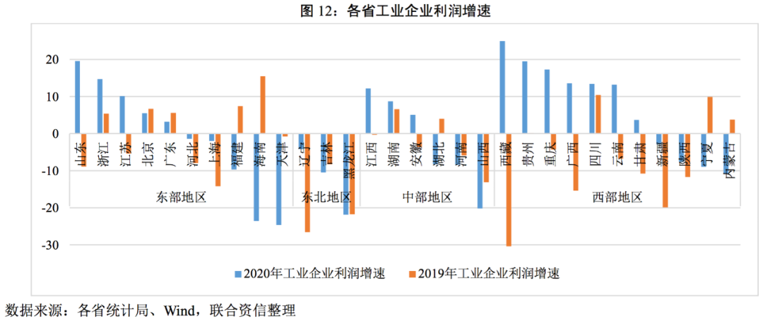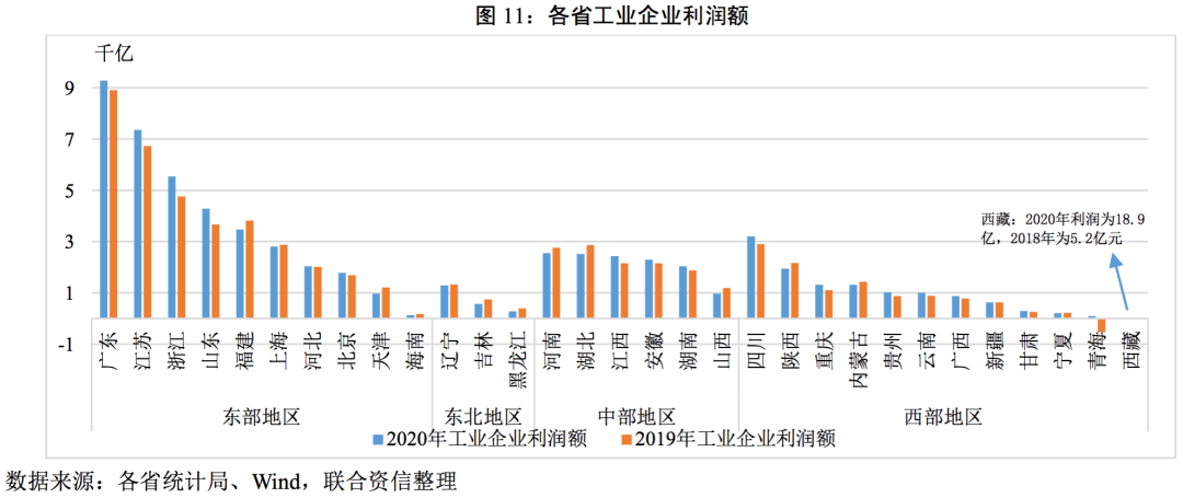從企業(yè)利潤(rùn)增速看,2020年工業(yè)利潤(rùn)增速最大值與最小值差距為44.30%(2019年為42.1%),地區(qū)間的差異較2019年進(jìn)一步加大。有15個(gè)省份工業(yè)企業(yè)利潤(rùn)為負(fù)增長(zhǎng),較2019年減少3個(gè)省份;17個(gè)省份工業(yè)企業(yè)利潤(rùn)增速超過2019年。分區(qū)域看,東部、西部和中部地區(qū)各省份分化均較為明顯,且有進(jìn)一步加劇的趨勢(shì),東北地區(qū)三省全部負(fù)增長(zhǎng),主要是因?yàn)?020年國(guó)際大宗商品價(jià)格不景氣在一定程度上壓縮黑色金屬以及石油開采及加工行業(yè)的利潤(rùn)。