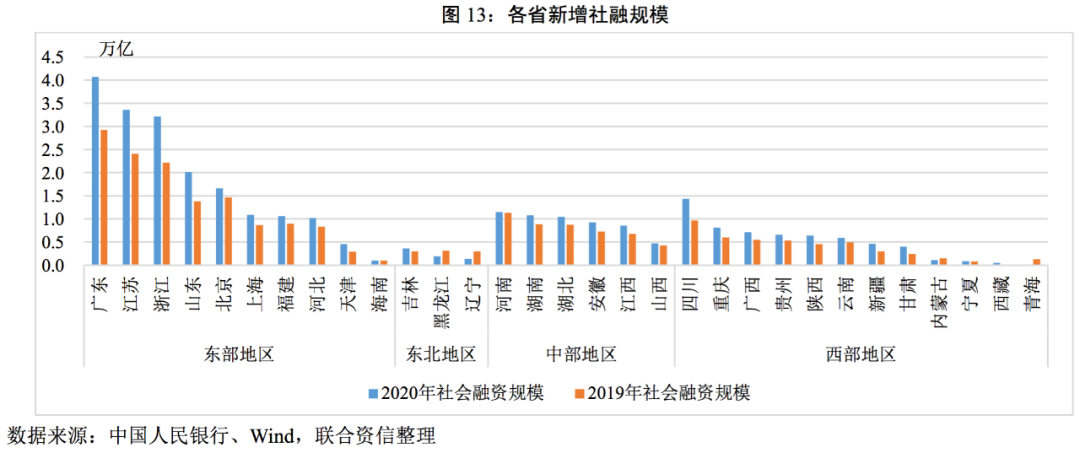 區(qū)域間的流動(dòng)性分化明顯,GDP規(guī)模較大的省份獲得了更多的流動(dòng)性支持。2020年,東部地區(qū)廣東、江蘇、浙江以及山東僅四個(gè)省份新增社融規(guī)模占全國(guó)新增社融的41.93%,東北地區(qū)新增社融規(guī)模比重只占全國(guó)新增社融的2.25%,地區(qū)間差異很大。整體看,2020年僅黑龍江、遼寧、內(nèi)蒙古以及青海的新增社融低于2019年水平,在全國(guó)新增社融大幅增長(zhǎng)的背景下,上述四個(gè)省份的新增社融規(guī)模反而較2019年下降,進(jìn)一步反映了資金的“擇優(yōu)”選擇性。從社融結(jié)構(gòu)看,各區(qū)域分化程度也較為明顯,東部地區(qū)對(duì)貸款的依賴度相較其他地區(qū)較低,直接融資比重較高;經(jīng)濟(jì)規(guī)模較小的省份,如青海、東三省,政府債券融資占比較高。