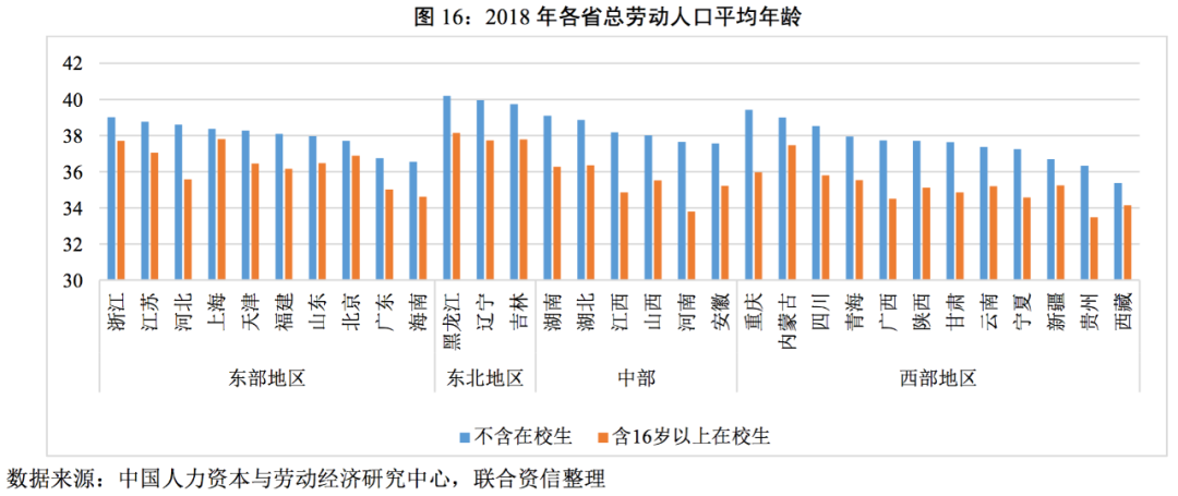從勞動(dòng)力人口來說,報(bào)告測(cè)算的數(shù)據(jù)顯示,1985-2018年間,全國(guó)勞動(dòng)力人口(包括學(xué)生)的平均年齡從32.2歲上升到了38.4歲。平均年齡最高的前五個(gè)省份是黑龍江、遼寧、吉林、重慶、湖南;平均年齡最低的五個(gè)省份是廣東、新疆、海南、貴州、西藏。勞動(dòng)人口的年齡分布基本與人口流動(dòng)相一致,北京、上海等老齡化已逐步抬頭的較發(fā)達(dá)城市,得益于勞動(dòng)力涌入而在該指標(biāo)中排名中等;東北三省多年以來的人口流出使得該地區(qū)的勞動(dòng)人口平均年齡顯著高于其他地區(qū)。