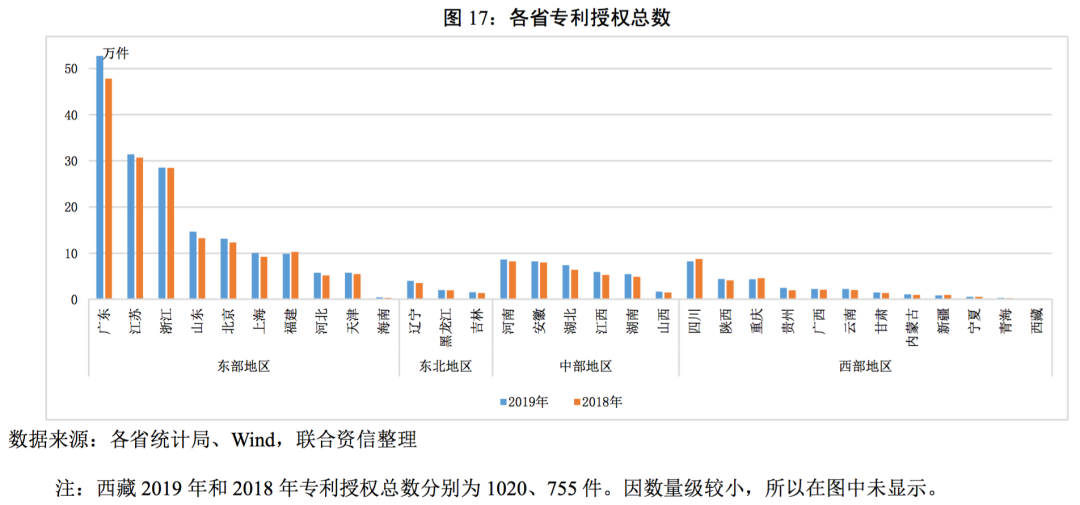 各省的科技水平也有較大差異。以專利授權(quán)數(shù)量作為各省科技水平的衡量,廣東、江蘇以及浙江具有明顯的優(yōu)勢(shì),整體來看,擁有專利數(shù)量在10萬件以上的省份共有6個(gè),且均集中在東部地區(qū)。整體看,專利授權(quán)數(shù)量與各省的經(jīng)濟(jì)實(shí)力呈正相關(guān)的關(guān)系,經(jīng)濟(jì)規(guī)模較大的省份擁有更多的專利數(shù)量。