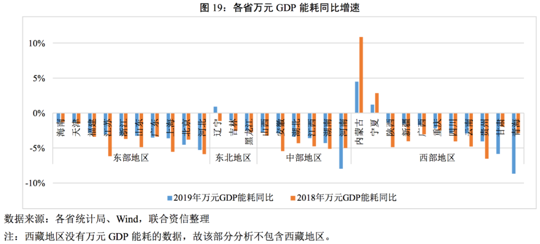 分區(qū)域看,2019年大部分省份的GDP能耗同比均有所下降,而內(nèi)蒙古和寧夏連續(xù)兩年均為正增長(zhǎng),且內(nèi)蒙古的增速高達(dá)4.49%,遼寧則由2018年的能耗下降轉(zhuǎn)為2019年的增長(zhǎng)。習(xí)近平總書記在十九屆五中全會(huì)、中央經(jīng)濟(jì)工作會(huì)議、中央全面深化改革委員會(huì)會(huì)議等重要會(huì)議多次強(qiáng)調(diào)了抓緊制定碳排放達(dá)峰與碳中和行動(dòng)方案,2020年《政府工作報(bào)告》規(guī)劃了“十四五”期間我國(guó)的能源消耗和碳排放工作。上述政策將會(huì)對(duì)以鋼鐵和石油化工等傳統(tǒng)工業(yè)為主的省份,如東三省、河北以及天津等,帶來較大的產(chǎn)業(yè)轉(zhuǎn)型壓力,同時(shí)對(duì)經(jīng)濟(jì)增長(zhǎng)帶來一定的壓力。