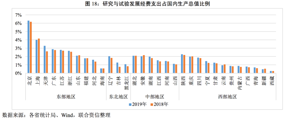 以科研經(jīng)費(fèi)支出占各省的GDP規(guī)模比例來衡量各省對(duì)科研的重視程度,各省的科研經(jīng)費(fèi)占GDP比例與專利總數(shù)呈現(xiàn)強(qiáng)正關(guān)系。科研經(jīng)費(fèi)投入作為后期經(jīng)濟(jì)效益的核心驅(qū)動(dòng)力,目前仍然主要集中于東部地區(qū)。經(jīng)濟(jì)規(guī)模較大的省份擁有更多的科研能力,科研支出費(fèi)用占比更大,而科研成果反過來也帶動(dòng)了當(dāng)?shù)亟?jīng)濟(jì)的發(fā)展,二者形成相互促進(jìn)的關(guān)系,形成了強(qiáng)者越強(qiáng)的趨勢(shì)。