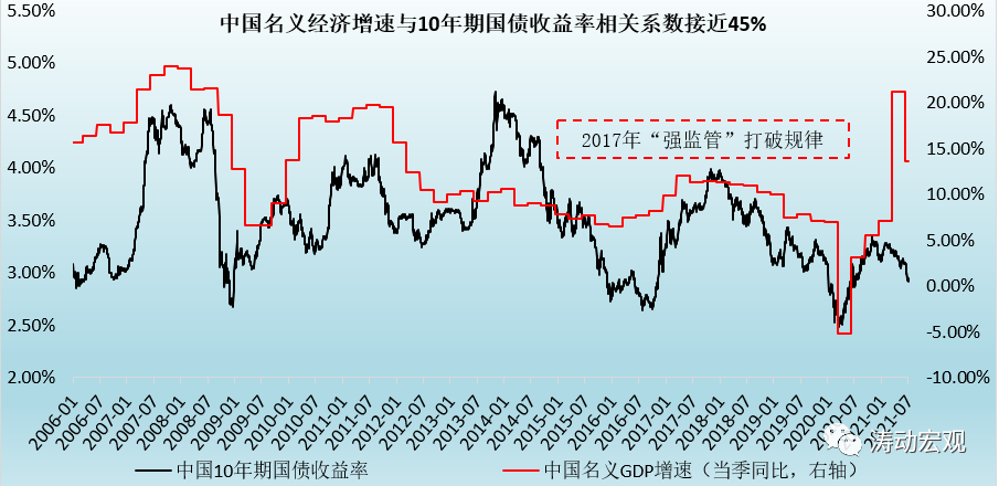 2、不過和美國一樣,中國的這種相關性同樣呈現(xiàn)出不穩(wěn)定性的特征,2010年之后這種規(guī)律曾兩次被主觀因素打破,分別為2013年的“錢荒”和2017年的“強監(jiān)管”,使得名義經濟增速在下行通道的過程中,10年期國債收益率仍然繼續(xù)大幅上行。其中,2013年10年期國債收益率甚至上行至4.55%附近,2017年也上行至4%左右。這使得2009年以來的經濟基本面與10年期國債收益率之間的相關系數(shù)降至40%附近。