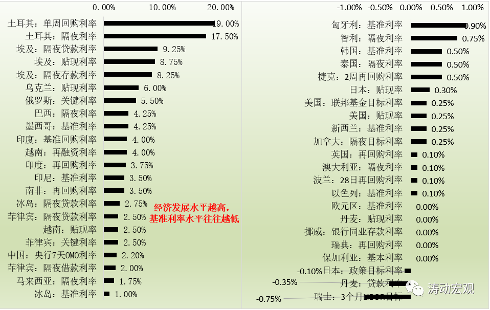以主要經濟體的最新基準利率數(shù)據為例,土耳其、埃及、烏克蘭、俄羅斯、巴西、墨西哥、印度、越南等經濟體的基準利率水平便比較高,而瑞士、丹麥、日本、挪威、加拿大、澳大利亞、新西蘭與美國等經濟體的利率水平便比較低。