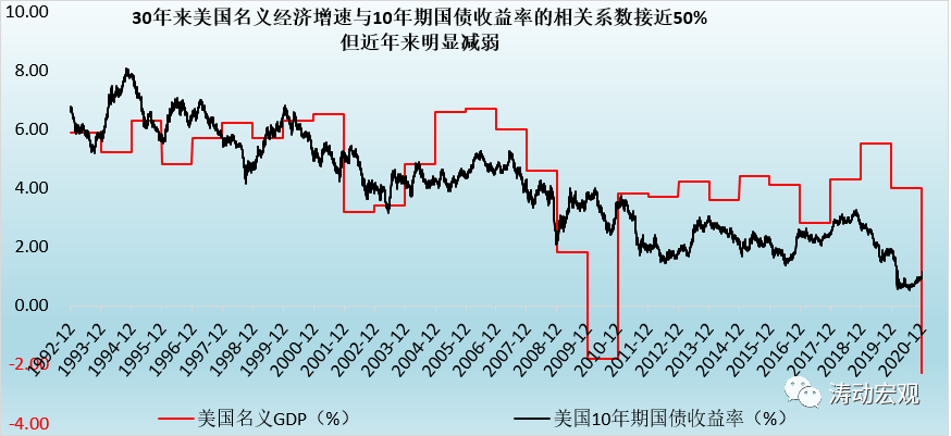 美國的數(shù)據可以向我們很好地證明這樣一個結論,即名義經濟增速不僅和長端利率水平高度正相關,在數(shù)值上甚至也比較接近。例如,1992年以來的30年,美國名義經濟增速與10年期國債收益率的相關系數(shù)接近50%。