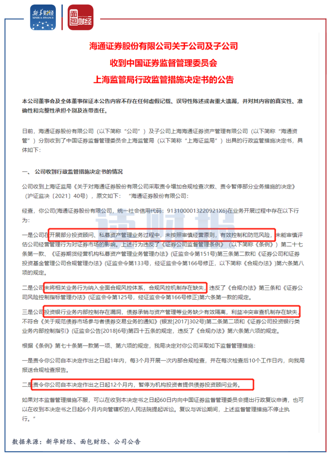 在資管業(yè)務(wù)方面,2021年3月,海通證券收到證監(jiān)會(huì)上海監(jiān)管局的行政監(jiān)管措施決定書,因?yàn)楹弦?guī)和風(fēng)控漏洞,監(jiān)管部門做出“12個(gè)月內(nèi),暫停為機(jī)構(gòu)投資者提供債券投資顧問(wèn)業(yè)務(wù)”的處罰決定。