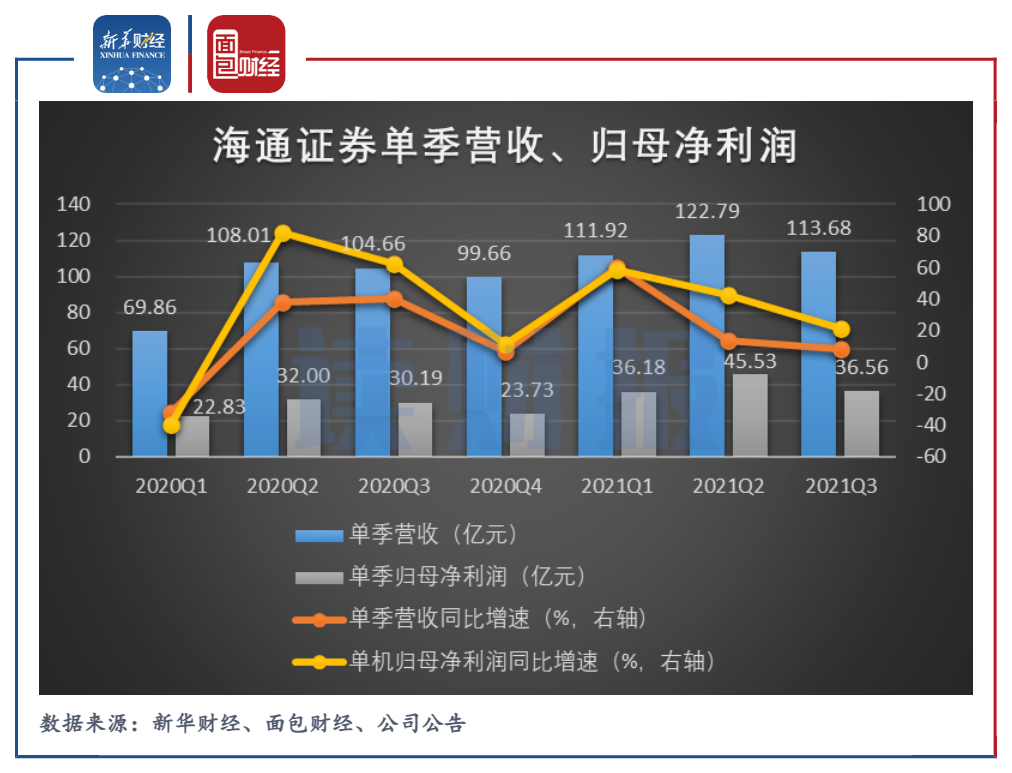 但是,2021年第三季度,海通證券的單季營(yíng)收與凈利潤(rùn)同比增速顯著下滑。財(cái)報(bào)顯示,2021年第三季度,海通證券營(yíng)業(yè)收入和歸母凈利潤(rùn)增速分別僅為8.62%和21.1%,較上半年明顯下降。