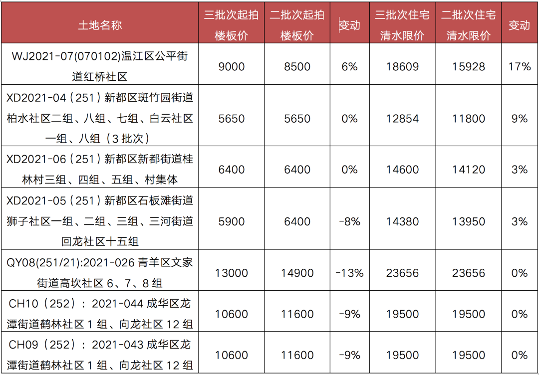 值得注意的是,成都第三輪集中供應地塊的商品住宅清水限價多較此前明顯提升。如高新區大源板塊宅地的商品住宅清水限價提升至28500元/平方米,是成都開啟住宅限價以來出讓地塊中商品住宅限價最高的地塊,天府新區華陽鶴林村地塊的限價也由此前的17700元/平方米提升至2萬元/平方米以上。而在7宗回爐宅地中,多數地塊的商品住宅限價也給予了抬升,漲幅由3%~17%不等。