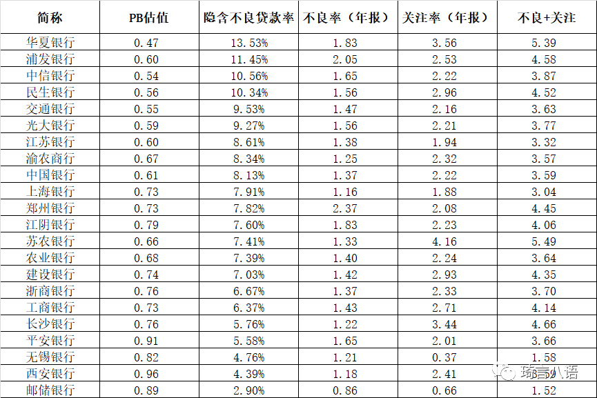 因此,可以參照當前的估值水平,根據(jù):銀行隱含不良率=【銀行貸款減值準備+(1-當前PB)*凈資產(chǎn))】/貸款余額,逆推出市場認為的隱含不良率,目的是可以在一定程度上考量銀行的真實不良率水平。