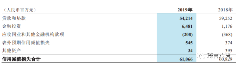 以招行為例,下圖是其2019年年報的信用減值損失明細披露,可以發(fā)現(xiàn)貸款和墊款信用減值損失是信用減值損失的最大組成部分,占比達88.78%,但同比下降8.63個百分點,主要是金融投資的信用減值損失同比增加451%。這體現(xiàn)出招行為應(yīng)對監(jiān)管新規(guī)而主動加大非信貸類資產(chǎn)的計提力度和審慎經(jīng)營的經(jīng)營理念。