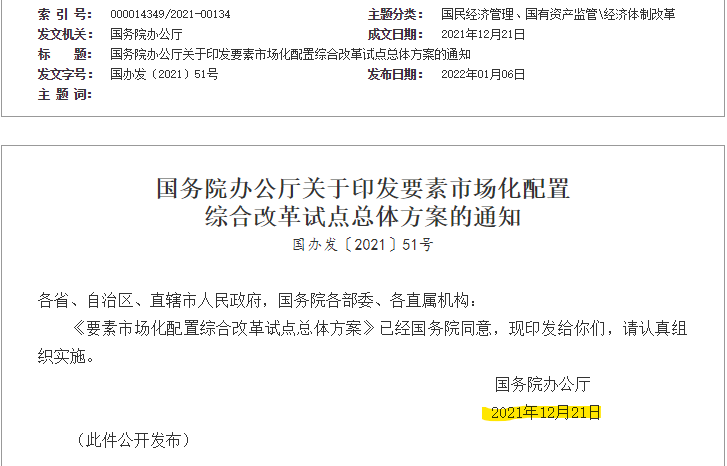 2022年1月6日,國辦對外發布了《要素市場化配置綜合改革試點總體方案》。方案是2021年12月21日印發的。