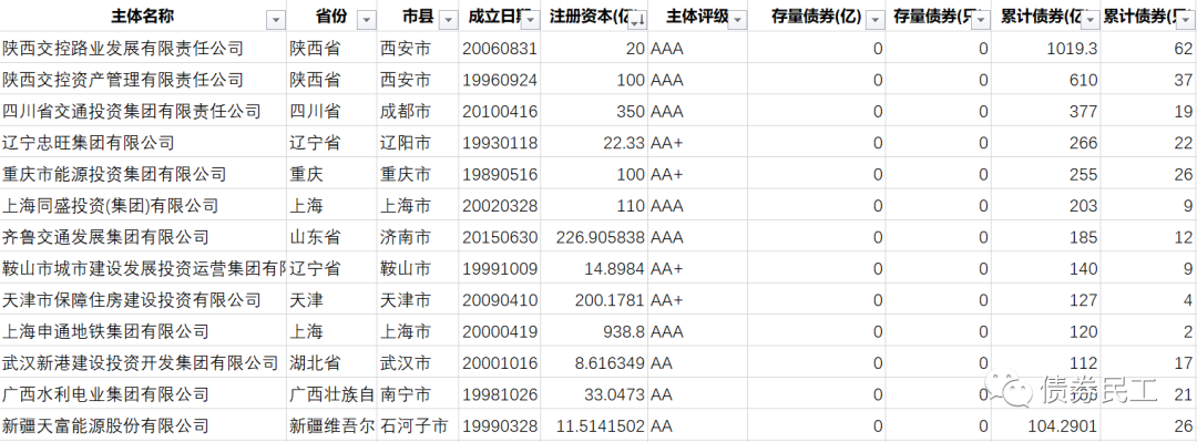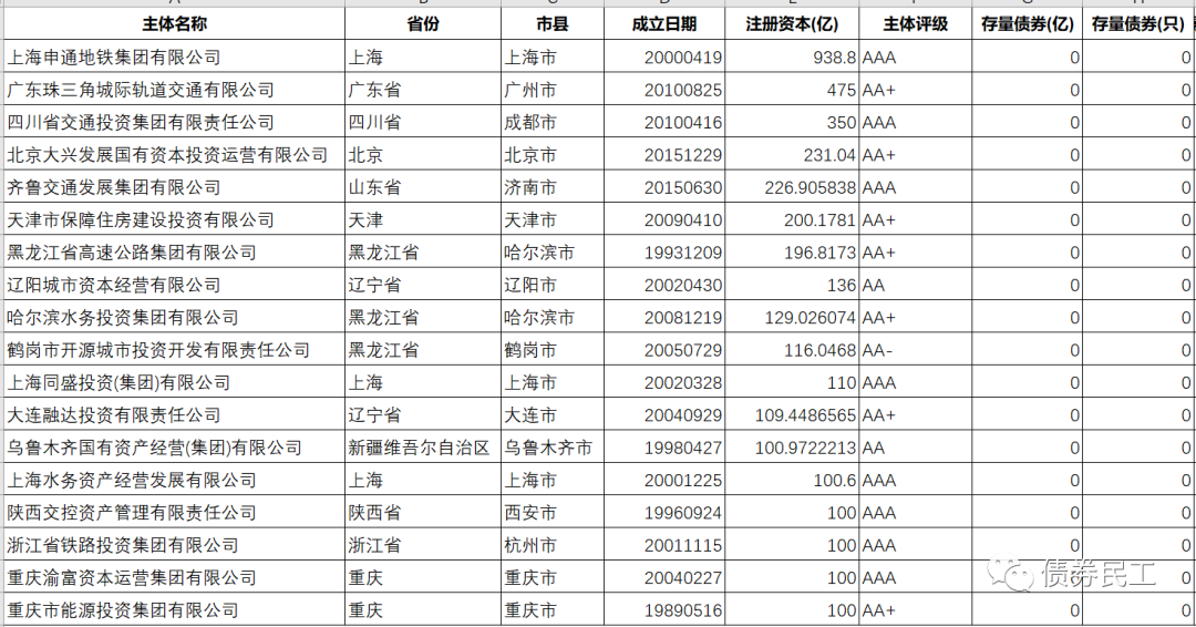 而在這些存量債券金額為零的城投公司發(fā)行人中,注冊資本超過100億元的有18家,其中注冊資本和實收資本最高的是上海申通地鐵集團有限公司,達到了938.80億元。