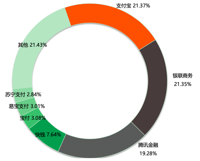 據易觀披露的最新數據顯示,截至2020年3季度末,從市場份額來看,我國第三方互聯網支付行業的前3名分別是——支付寶占比為21.37%,銀聯支付占比為21.35%,騰訊金融占比為19.28%??梢钥闯?,支付寶、微信兩大巨頭在互聯網支付合計占比近五成。