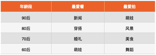 不難看出,21-25歲人群占據抖音用戶的主導位置,并且90后擁有穩定工作、是支撐消費市場的主力人群。從用戶偏好來看,不同年齡段的人群需求偏好存在一定差異性,譬如:女性偏愛潮流推薦和生活記錄;男性偏愛知識快訊;搞笑視頻和才藝視頻則受眾廣泛。