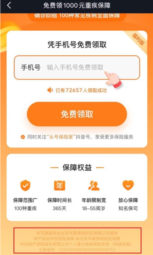 二是在保險生態布局方面,抖音與華農財產保險有限公司推出頭號保,主要針對各種疾病,憑手機號免費領1000元重疾保障。其中,百萬醫療險涵蓋大病小病,最高600萬保額,首月只要1元,后續每月15.55元起。