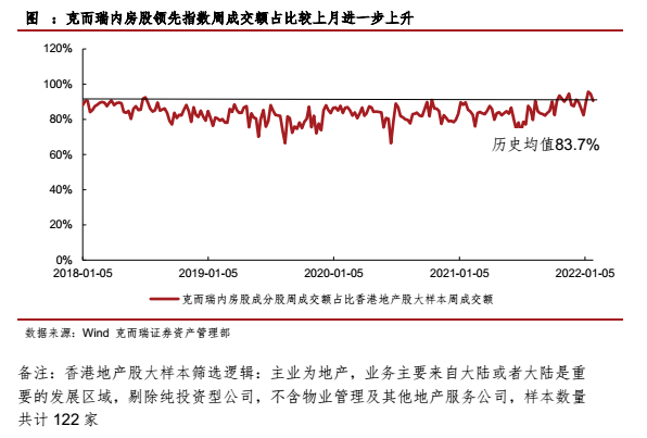 1月克而瑞內房股領先指數成交額占香港地產股大樣本的成交額比值總體較上月進一步上升,走勢向下。1月該指數成交額占比周均值92.5%,高于歷史均值83.7%,高于上月周均值87.4%,于月末同樣出現占比明顯下降的情況,使總體走勢向下。