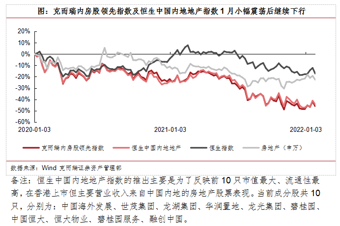 2022年1月,恒生指數上升1.7%,克而瑞內房股領先指數上升6.9%,恒生中國內地地產指數上升6.7%,房地產(申萬)板塊下降1.3%。