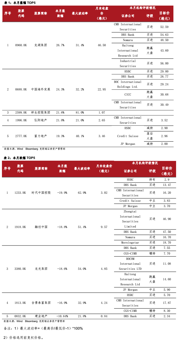 1月,成分股表現較好。龍湖集團、中國海外發展、祥生控股集團漲幅居前;而時代中國控股、融創中國、龍光集團則跌幅居前。