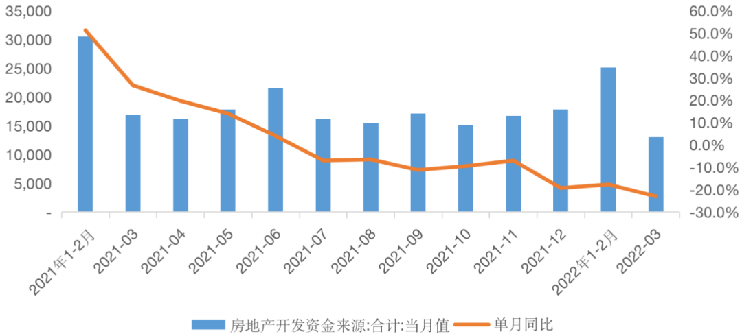 國家統計局數據顯示,3月到位資金13016億元,同比下降23.0%,降幅環比擴大5.3個百分點,從而使得到位資金的累計值降幅進一步擴大,2022年1-3月到位資金為38159億元,同比下降19.6%,降幅環比1-2月的17.7%進一步擴大。
