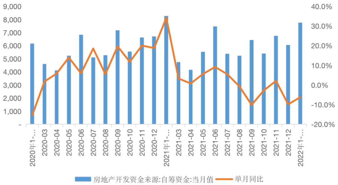 圖:2020年以來房地產到位資金(自籌資金)當月值及同比增速(單位:億元,%)