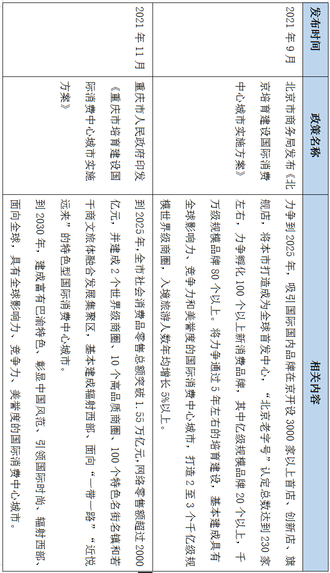 上海打造全球新品首發地、全球消費目的地; 北京突出大國首都功能,打造一批具有國際影響力的消費地標; 廣州打造“廣聚天下客、廣賣天下貨、廣貨賣天下”的國際消費高地; 天津打造面向東北亞,輻射俄羅斯和中東歐的特色型國際消費中心城市; 重慶打造富有巴渝特色,輻射西部地區、面向東南亞南亞的特色型國際消費中心城市。