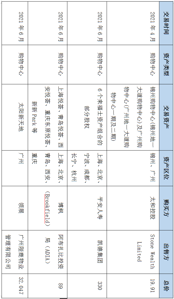 據睿和智庫不完全統計,2021年大宗交易市場上,購物中心相關資產交易共19筆,總交易金額744.7億元。購物中心相關資產數量雖不及辦公類資產,但資產交易金額和體量都相對較大,其中最大一筆收購案來自于,平安人壽330億元收購凱德旗下六個來福士項目的部分股權。