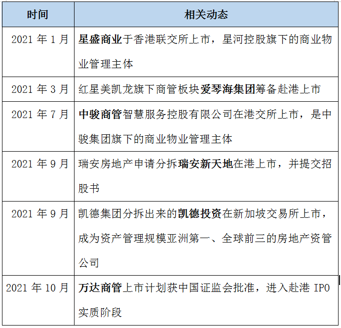 繼2020年華潤萬象生活、寶龍商業先后從母公司中獨立拆分上市后,2021年星盛商業、中駿商管也相繼從母公司中成功分拆上市,萬達、愛琴海、瑞安新天地也加入商管公司赴港上市的大潮中。