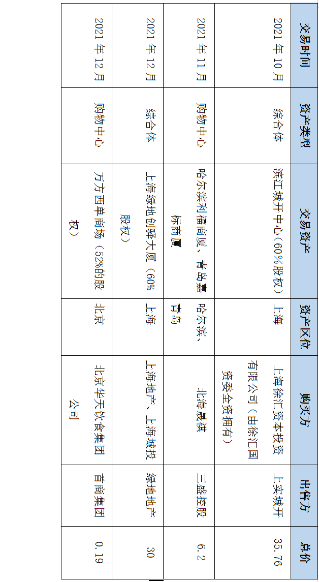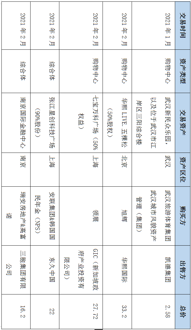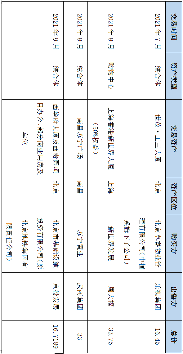 表2:2021年度商業地產(購物中心)大宗交易匯總(單位:億元)