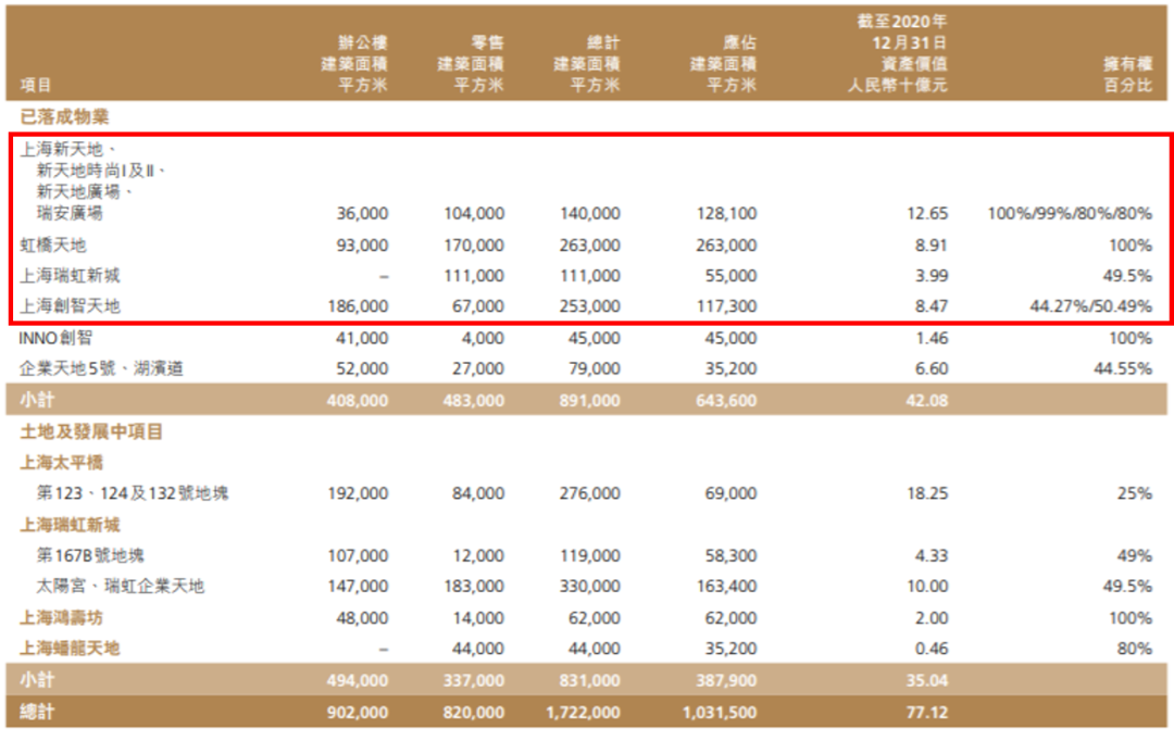 另據2020年瑞安房地產年報顯示:“本集團目前於上海持有及管理作零售及辦公樓用途的總建築面積達172萬平方米(「上海物業組合」)。截至2020年12月31日,上海商業物業組合的資產價值總額約為人民幣770億元。”