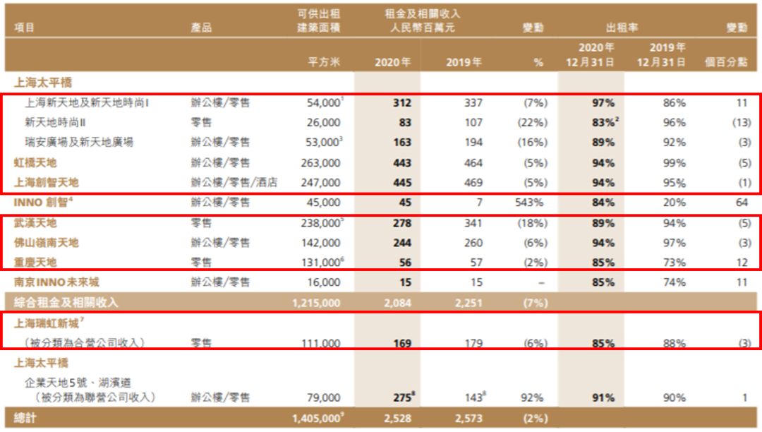 其中,中國新天地負責營運管理的7個項目租金收入總計21.93億元,占總收入的87%,項目平均出租率為90%。