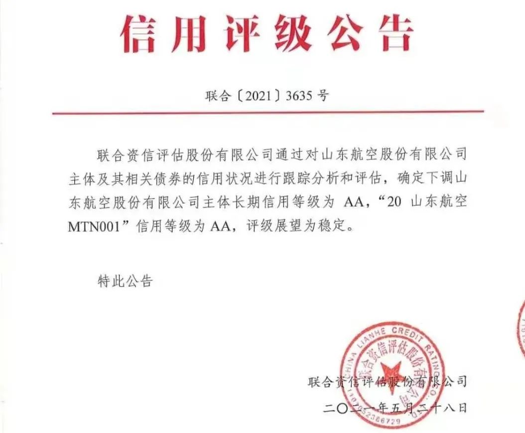 根據(jù)公開信息,山東航空于2020年3月18日首次取得聯(lián)合資信AAA主體信用評級,并分別于2020年5月29日、2020年9月17日取得AAA主體信用評級。山東航空最新的評級就是2021年5月28日主體評級下調(diào)至AA。